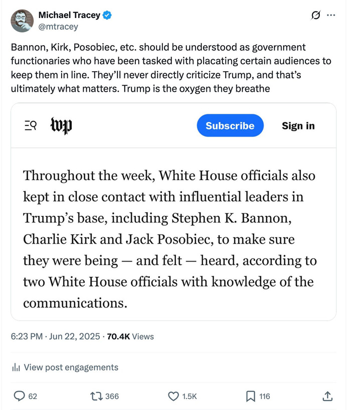 I’d vaguely known that Kirk was a young conservative activist who had dropped out of community college as a teenager about a dozen years earlier to found Turning Point USA, an activist organization intended to draw youthful Americans into his ideological camp, and heavily funded by mega-donors, it had grown large and successful over time. Those bare facts exhausted my total knowledge. Given that I’d paid so little attention to him, I was initially shocked by the enormous outpouring of media coverage his killing generated, seemingly greater than might have been accorded many important American elected officials or even major world leaders under similar circumstances. All our top newspapers gave his story large, front-page headlines, and the discussion of Kirk’s assassination and its implications entirely blanketed much of the Internet. I’d always regarded Kirk as a rather bland mainstream Trump conservative, hardly the sort of figure most likely to inspire lethal hatred. I wondered whether my impression had been mistaken so I sought to assess his views and positions, and get a better sense of why he had been targeted in that deadly attack. Given his brutal slaying at such a young age, I was hardly surprised that a large fraction of the commentary amounted to hagiography, with even most of his erstwhile ideological foes mourning his death as a tragedy and casting aside any past criticism. Indeed, when Matthew Dowd, a prominent former Bush-Cheney Republican political consultant made some disparaging remarks about Kirk, he was immediately fired from his longstanding position at MSNBC, demonstrating the risks of straying from that widespread position. Fortunately, I found some important exceptions to this pattern of unremitting praise. I’d occasionally read pieces by Michael Tracey, a prominent moderate or liberal-leaning Internet writer and the day after Kirk’s death he published a harsh 1,400 word column providing a very different perspective on Kirk. Many of Kirk’s supporters had described him as a political truth-teller, with President Donald Trump declaring that he had been “a martyr for truth.” But Tracey was scathing in his criticism, portraying him as essentially a political propagandist, someone who regularly shifted his positions to conform to those of Trump, his leading patron: He was a government functionary. A mouthpiece. He trafficked in ludicrous propaganda on behalf of the Administration he loyally served. And was doing this basically 24/7, in the extremely recent past. Perhaps most notoriously, after taking a personal phone call from Donald Trump, Charlie Kirk hopped on his podcast the next day and proclaimed, “Honestly, I’m done talking about Epstein for the time being. I’m gonna trust my friends in the administration. I’m gonna trust my friends in the government.” He then bizarrely tried to deny that he said this, or insist it had somehow been taken out of context — which it hadn’t. The context was that Trump got annoyed that a bunch of people had criticized him over Epstein at Kirk’s “Turning Point USA” conference, and then Trump called up Kirk, and then shortly thereafter, Kirk announced he was going to do the government’s bidding. That’s just what Kirk was, and the role he played in US political affairs — notwithstanding how people might now want to exalt him as a paragon of truth-telling virtue because of his untimely death.