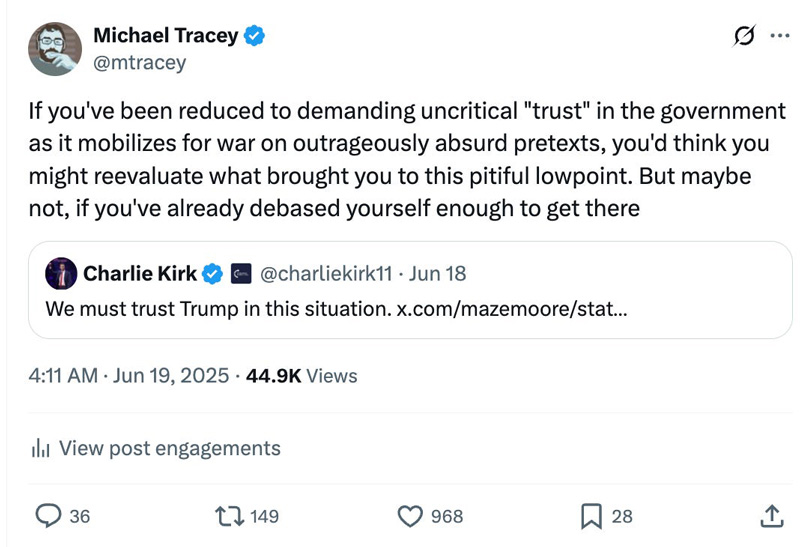 His conduct was even more egregious in the run-up to Trump bombing Iran in June. During that episode, he pretty much served as a blatant government disinformation agent. Harsh as that might sound after he was brutally gunned down yesterday, it’s simply true. His mission was to demand uncritical faith in the US government, during a time of war — which is totally inexcusable for anyone who would consider themselves anything even remotely approximating a “journalist.” But that’s clearly not what Charlie Kirk considered himself. He instead considered himself a government media mouthpiece. On April 3, he said “A new Middle East war would be a catastrophic mistake.” Then by June 17, as drumbeats for the joint US-Israeli war against Iran were intensifying to full volume, Charlie changed his tune to mollify Trump, whom his whole identity was built around sycophantically serving. “It is possible to be an extreme isolationist,” Charlie Kirk warned his massive audience. “President Donald Trump is a man made for this moment, and we should trust him.” This was just pathetic. Turn off your critical thinking skills and place unquestioning “trust” in the US government to wage a war on false pretenses! What awesome, noble “truth-telling”! Kirk then called for Trump to receive the Nobel Peace Prize, for the peace-bringing act of launching a new war in the Middle East. As I wrote at the time, “The shamelessness of these people has no bottom — it’s gotten to the point where you just have to marvel at the spectacle.” That was Charlie Kirk. He openly deceived his viewers and listeners, falsely insisting that Trump had been courageously pursuing “peace,” when in reality Trump was mobilizing for war in conjunction with Israel. At the time, I labeled Kirk a “depraved minion” for doing what he did, and I’m not about to retract that accusation just because he got killed yesterday. That would be absurd. “We must trust Trump,” declared Charlie Kirk, the martyred truth-teller: