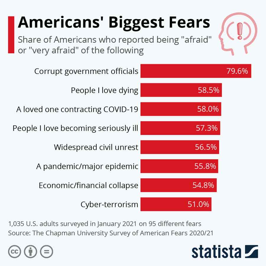 The Survey of American Fears polled 1,035 U.S. adults on their levels of fear across 95 different options. For the fifth year in a row, "corruption of government officials" led the ranking with 79.6 percent of respondents saying the prospect made them "afraid" or "very afraid".