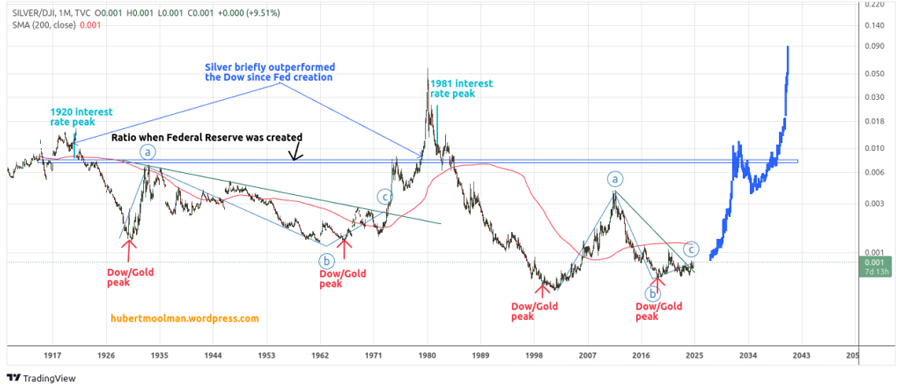It was only during brief periods before the 1919 and 1980 silver peaks that silver was able to outperform the Dow (see the Dow/Silver chart below).