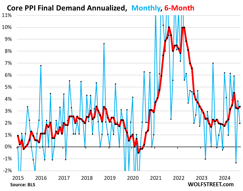 And on Friday, the core Producer Price Index was made a lot worse by big up-revisions of prior months, which caused the six-month average (red) to accelerate to +3.4% annualized for September. Last year, it had hovered nicely around the 2% line.