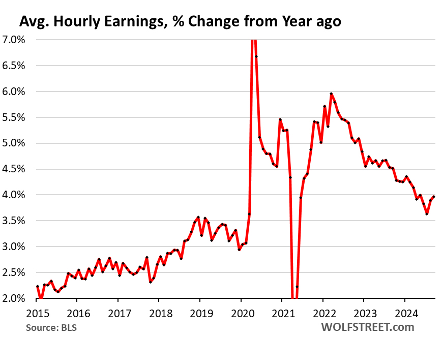 But with the strong September jobs report came the up-revisions of prior data that prompted this headline here: OK, Forget it, False Alarm, Labor Market Is Fine, Bad Stuff Last Month Was Revised Away, Wages Jumped. No More Rate Cuts Needed?