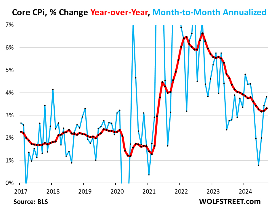 Core CPI, which excludes energy products and services and also food, accelerated for the third month in a row in September to +3.8% annualized (blue line), which caused the 12-month rate to accelerate to 3.3% (red line).