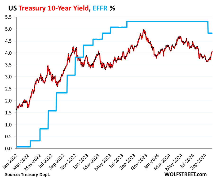 Longer-term yields are also driven by supply, and there will be a tsunami of supply over the next few years as Congress and the White House – whoever will end up in it – are recklessly ballooning the deficit, and thereby the issuance of new debt to fund the ballooning deficit, including 10-year Treasury notes.