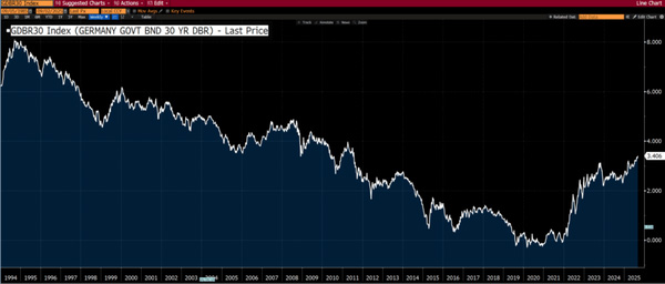 Germany itself hasn’t escaped. Even with a AAA rating, bund yields climbed as fiscal rules were suspended to fund defense and energy spending. Though the rise was smaller than in France or the UK, it shows that even disciplined countries are caught in this global wave.