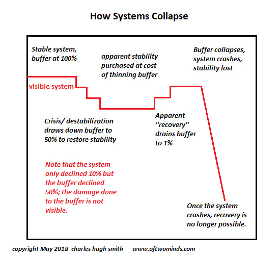 Those with the thinnest buffers may well experience the recession as a Depression. In maintaining the illusion of “growth” and “wealth,” we’ve thinned the system’s buffers to the point where any shock will collapse structures that looked solid because maintaining the appearance of stability was the entire point.