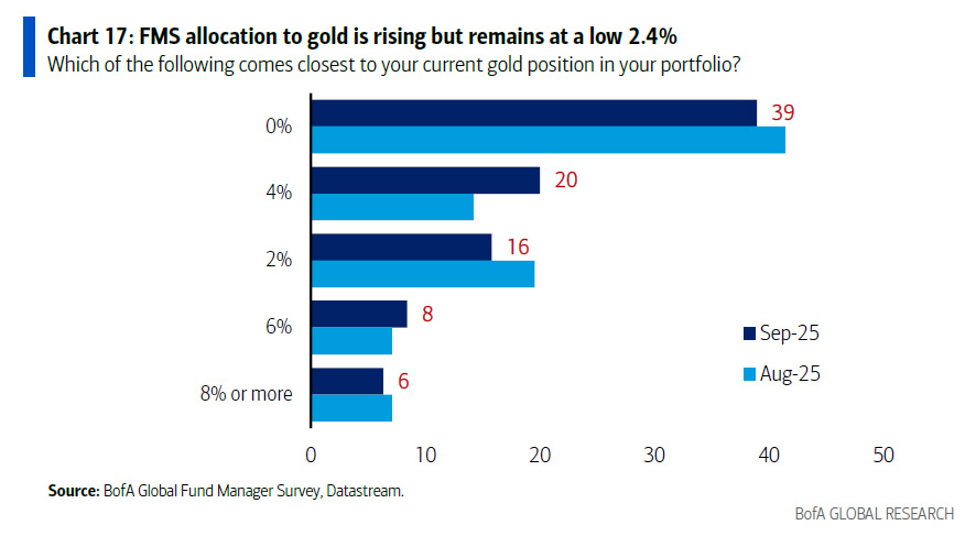 As we can see, 39% of fund managers still have 0% exposure to gold. That means no miners, no ETFs, no bullion, nada. But note the difference between August (light blue) and September (dark blue). The number of investment pros with no exposure to gold is shrinking.