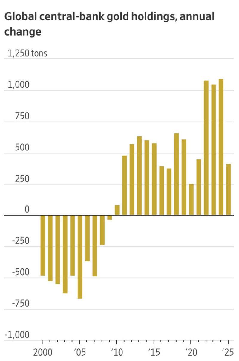 The vast majority of gold buying is still coming from central banks, not investors. See the chart below, showing the annual change in reported central bank gold holdings, via WSJ.