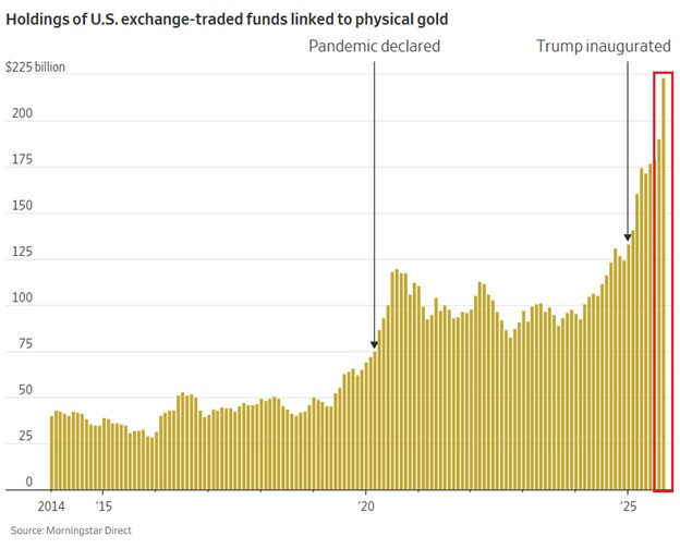 Note the massive spike starting in 2022, when the Biden admin and EU seized Russian central bank holdings in Europe. That was the catalyst which ignited a move out of dollars and into real money. Also, the 2025 data is only through the first half of the year.