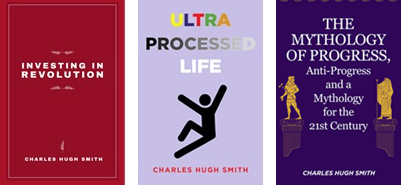 Ultra-Processed Life discusses the other lived reality that people feel but have difficulty articulating: authenticity has been replaced with artifice throughout the economy and society. Authors Guy Debord (The Society of the Spectacle, 1967) and Daniel Boorstin (The Image: A Guide to Pseudo-events in America, 1962) both addressed this process in the 1960s, but in the Internet Age, the substitution of artifice has expanded to become the dominant realm of experience. It has become so normalized we're no longer aware of what's been hollowed out or lost.