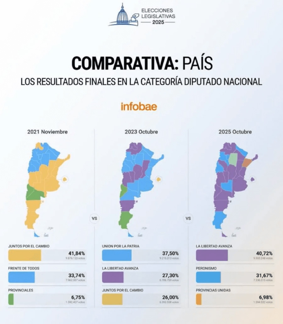 Historic… Momentous… Crushing… These are just some of the words missing from the mainstream media’s “reporting” of Argentina’s midterm election yesterday. Defining… Landslide… and Humiliating were also conspicuously absent from the shame-free establishment bullhorns. And yet… Not since the country was returned to democracy, back in 1983, have the long-suffering Argentine people delivered such a resounding defeat to their undead Peronist overlords. Indeed, an historic victory for the Libertarians hardly begins to cover it. First, the raw numbers… Purple Tide Rising Javier Milei’s La Libertad Avanza (LLA) won 41% of the vote… trouncing the Peronist’s 31.6%. They also added 64 “deputies” (seats in the nation’s lower house of congress, bringing their total to 95) and 13 senators (going from 7 to 20). Not only was the voter spread the single largest drubbing for the well-deserving Peronists in the country’s modern democratic era, with their additional seats in congress, Milei’s LLA party also sailed past the key one-third threshold, which means they now have the power to block and veto bills. And unlike his presidential election back in 2023, when the country was experiencing fuel shortages and looking down the barrel of crippling hyperinflation and, thus, was willing to roll the dice on an “anyone else” candidate, yesterday’s voters have had almost two years to witness Milei’s performance in action and to better judge for themselves. Which they did. Across the country, the call to “paint it purple” (LLA’s color) was heard. And boy did the voters send the Peronist establishment a clear signal. The following graphic, from local newswire Infobae, shows the rising purple tide, from zero in 2021… to it’s (so-far) high water mark today…