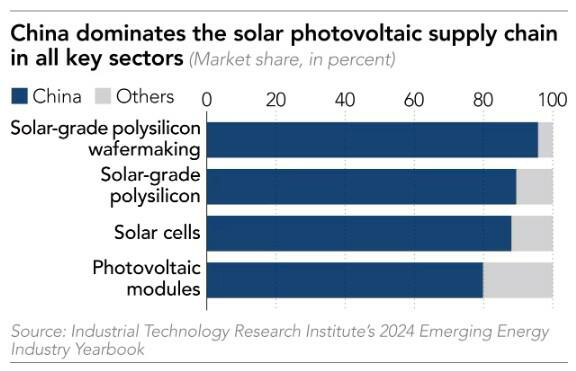 Despite efforts by the U.S. and India to localize production, China is projected to maintain over 80% of global photovoltaic manufacturing capacity by 2030, with its solar products costing 20-30% less than competitors, according to the IEA. Analysts attribute China's edge to its economic scale, advanced technology, and cost efficiency. Even as countries impose trade barriers to curb dependence on Chinese products, demand for China’s affordable solar solutions remains strong globally. Companies like Foxconn highlight that Chinese solar energy rivals fossil fuels in cost, driving its adoption worldwide, particularly in markets eager to expand renewable energy capacity. China’s dominance in solar wasn’t always guaranteed. In the 2000s, Japanese and Taiwanese firms led the photovoltaic industry, but China’s massive scale and government subsidies allowed it to outpace competitors. Now, China controls over 90% of the solar supply chain, from polysilicon production to module manufacturing. By Zerohedge.com