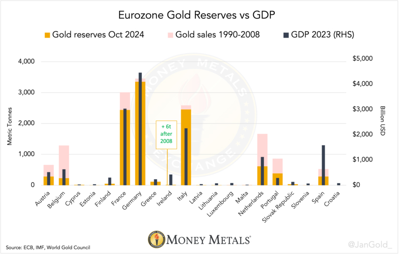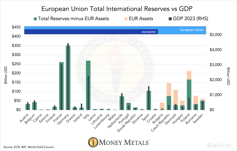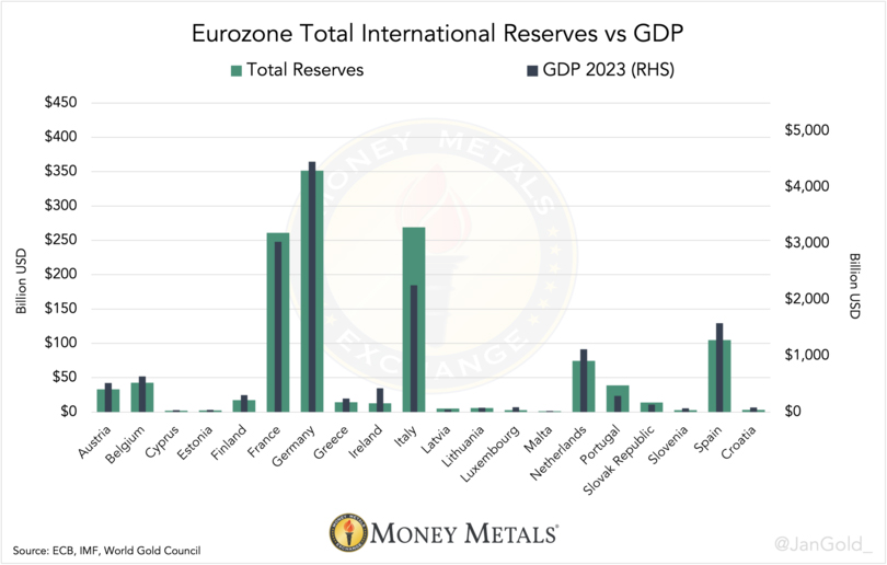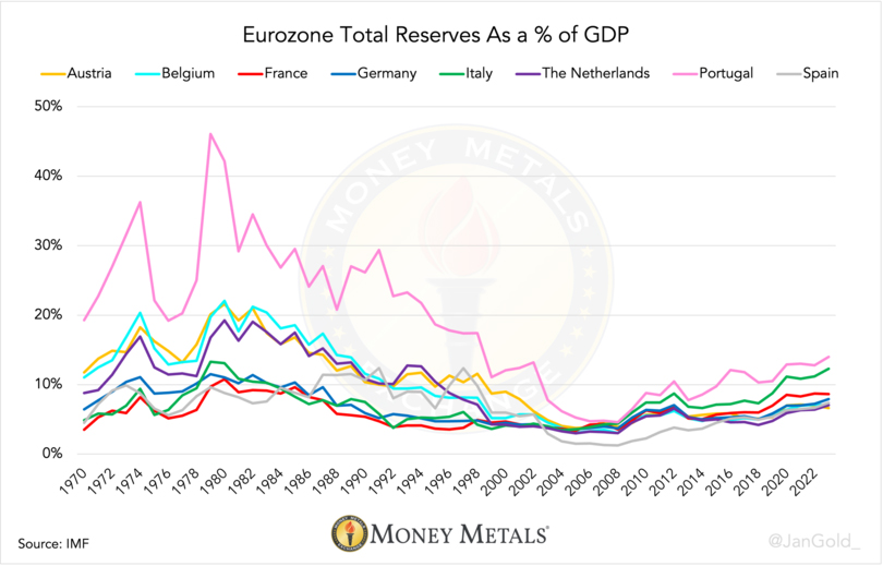 Chart 3. Eurozone Total International Reserves vs GDP. Source: ECB, IMF, World Gold Council, Money Metals Exchange. Within the eurozone, some central banks (that hold too little or too much gold on a relative basis) might cooperate by swapping foreign exchange for gold before gold is revalued. That way, they enjoy the same advantages in their gold revaluation accounts, which can be used to offset bad debt on their balance sheets. This would be the crown on the monetary reset. When one sees a visual representation of the total-reserves-to-GDP ratios within the eurozone over time, the coordination of reserves management among these countries is astounding.