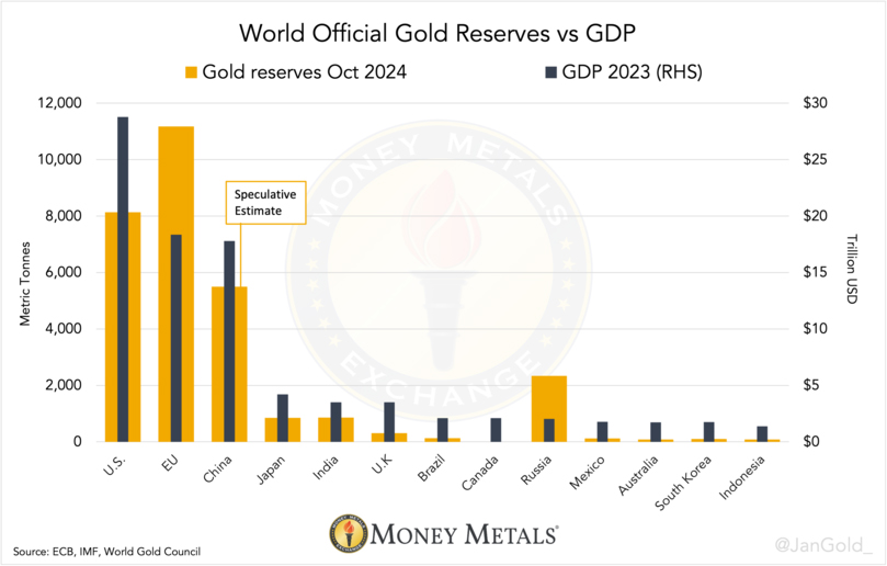 Chart 5. For “advanced economies” such as Denmark and Sweden, it’s politically sensitive to buy gold. European Union (EU) Gold Reserves vs GDP. Source: ECB, IMF, World Gold Council, Money Metals Exchange.