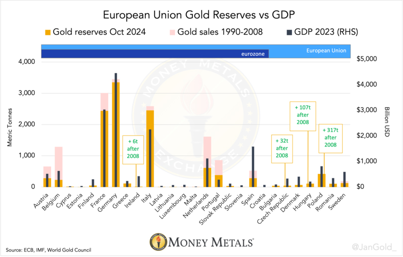 Hungarian monetary gold held domestically displayed for the central bank’s 100th anniversary in 2024. Hungary has bought and repatriated gold since 2018. The Czech Republic announced it will keep buying gold until it reaches 100 tonnes, and Poland says it is aiming for a little less than 600 tonnes. Both levels would get these countries more in line with the eurozone average gold-to-GDP ratio. Although I had my suspicions, up until recently, I had never read anything from Eastern Europe about balancing gold to GDP ratios. But then I saw a podcast by Parallel Systems from October 16, 2024, that discussed a quote from Konrad Raczkowski, former Minister of Finance of Poland. The quote was taken from a recent article by Raczkowski in a print magazine published by the central bank of Poland (NBP). From Raczkowski:
