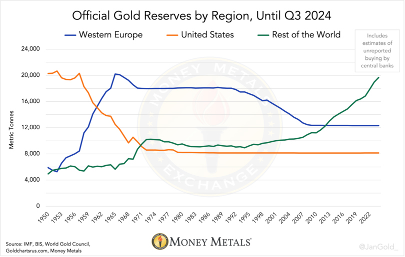 As the United States, issuer of the world reserve currency, has arrived at a critical phase in its debt spiral and as geopolitical tensions keep mounting, it’s of paramount importance we evaluate what gold’s role will be in the international monetary system moving forward. Gold Is Central Banks’ Plan B Most of the largest central banks have a “Plan B” when their paper policy goes haywire, and this backup plan is, to a certain extent, coordinated between them. The first seeds of Plan B were planted by European central bankers and politicians in the 1970s. Only the U.S., together with some of its most obedient vassal states, has been unwilling to cooperate. Plan B, of course, is gold, owned by virtually every monetary authority on this planet and bought by non-Western central banks in record amounts in the past years in response to dollar weaponization and debasement (see chart 1 below). A marked change in the international monetary order awaits us. Why European Nations Want to Evenly Spread Gold Reserves During the demise of Bretton Woods, it was clear that several European countries wanted to switch to a gold standard. They couldn’t pull it off at the time, partly because the United States was using its military strength to block such efforts. Another reason was that the world’s monetary gold was unevenly distributed at the time. Most metallic reserves were held in Western Europe1.