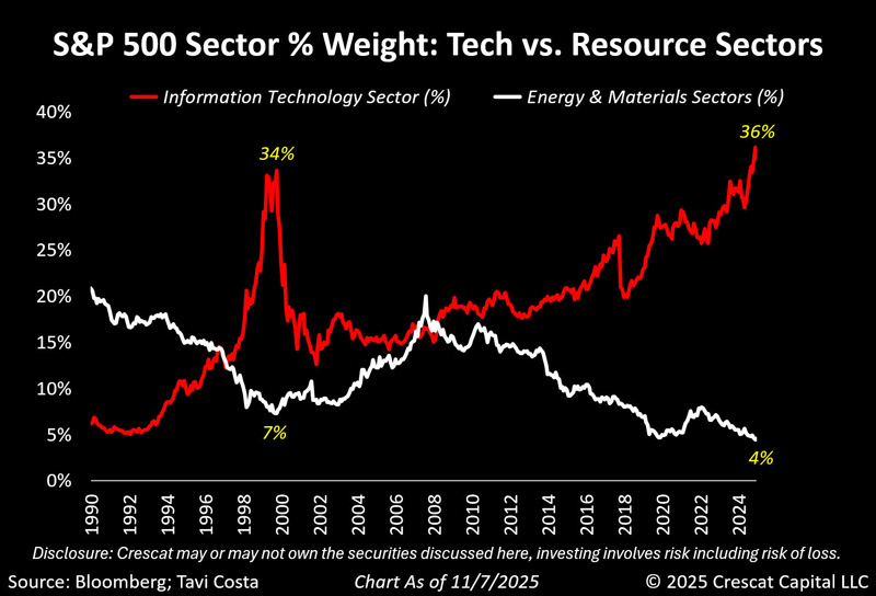 For investors, now is the time to start diversifying into natural resources. See the chart below, which shows the S&P 500 weightings of tech vs energy and materials: