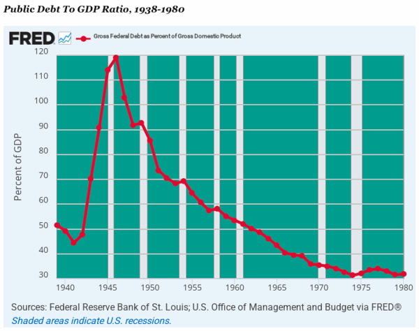 In fact, when the GOP-Dixiecrat coalition put an end to the New Deal in 1938, the public debt stood at 52% of GDP – before the exigencies of WWII sent the ratio soaring to a peak of 120% of GDP in 1946.