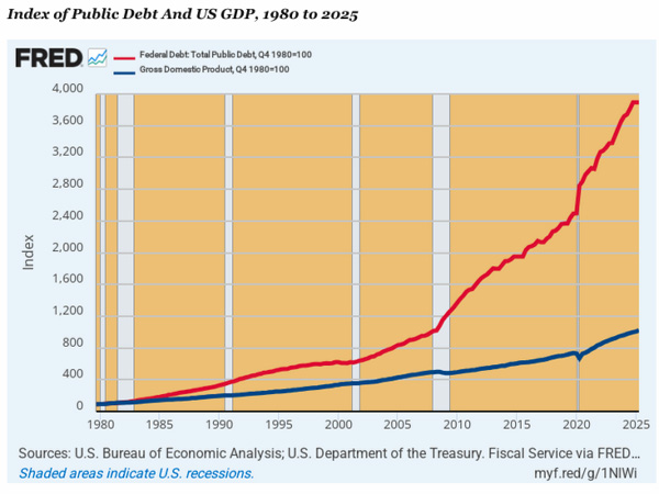 Yet that’s the sum and substance of America’s fiscal path since 1980. In the graph below, both variables are indexed to the levels of Q4 1980—so the ever-widening gap between the public debt (red line) and the US economy’s capacity (blue line) to carry it is unmistakable.