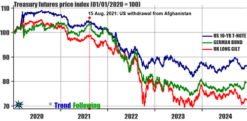 During the second quarter of 2021, US, UK and German treasuries started to recover back toward their all-time highs, but that rally failed almost immediately after the U.S. pullout from Afghanistan. Only six months later, the war for Ukraine’s democracy and freedom started. At first, as the West hit Russia with massive sanctions, a wave of optimism pushed the bond prices higher, but that optimism was very short-lived. anyone who wished to look at things as they are, rather than as they wished them to be understood that Ukraine stood no chance in that war: even Barack Obama understood this in 2014 and declined to intervene militarily.