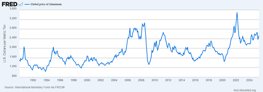 In the 1800’s the “silver from clay” was more expensive than gold. The light, silvery metal was so rare that architects crowned the Washington Monument in D.C. with a six-pound pyramidal capstone. The metal, if you haven’t guessed yet, is aluminum. The reason it was so rare and expensive was due to the difficulty of producing the raw metal. Most aluminum comes from bauxite, which is aluminum oxide – basically rust. It’s formed when granites break down into aluminum-rich clays. To separate the aluminum metal from oxygen, it takes a huge amount of electricity. The final smelting process requires aluminum oxide (alumina) to be heated to more than 1,700 degrees F and chemically separating the metal. According to Yahoo Finance, every metric ton of aluminum required 14 megawatt-hours of electricity. That’s equal to powering the average American home for 18 months. That’s why it was so difficult to make, historically. In 1852, an ounce of aluminum cost $34 per ounce. Gold was just $19 per ounce. That’s no longer the case. A pound of aluminum today is around $1.15 per pound. But that price is going up.